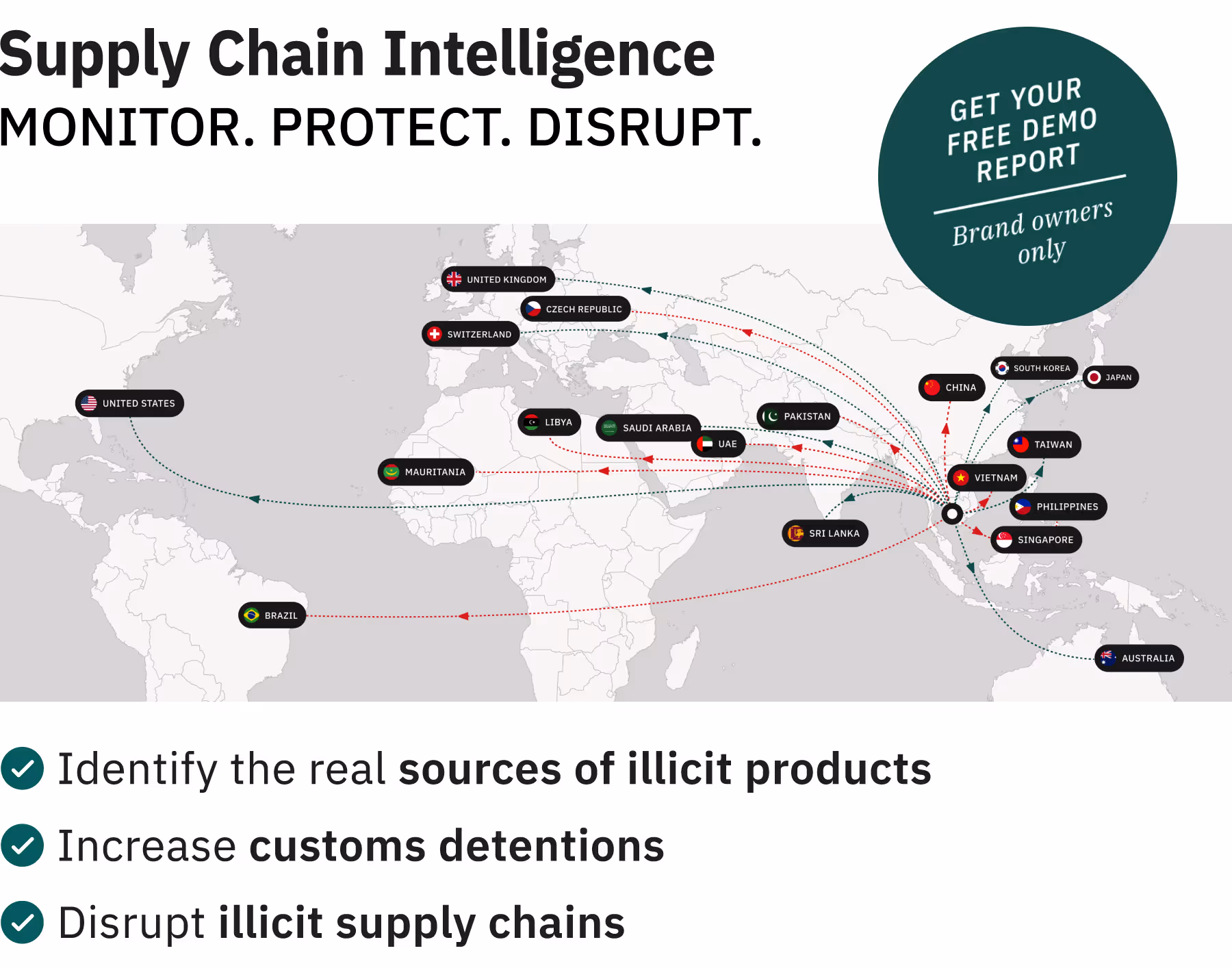 ApiraSol is able to quickly map shipments of trusted and suspicious products. Your free report will be delivered within 2–3 weeks. Please fill out the form with your company details and specify the brand and product you want to focus on.